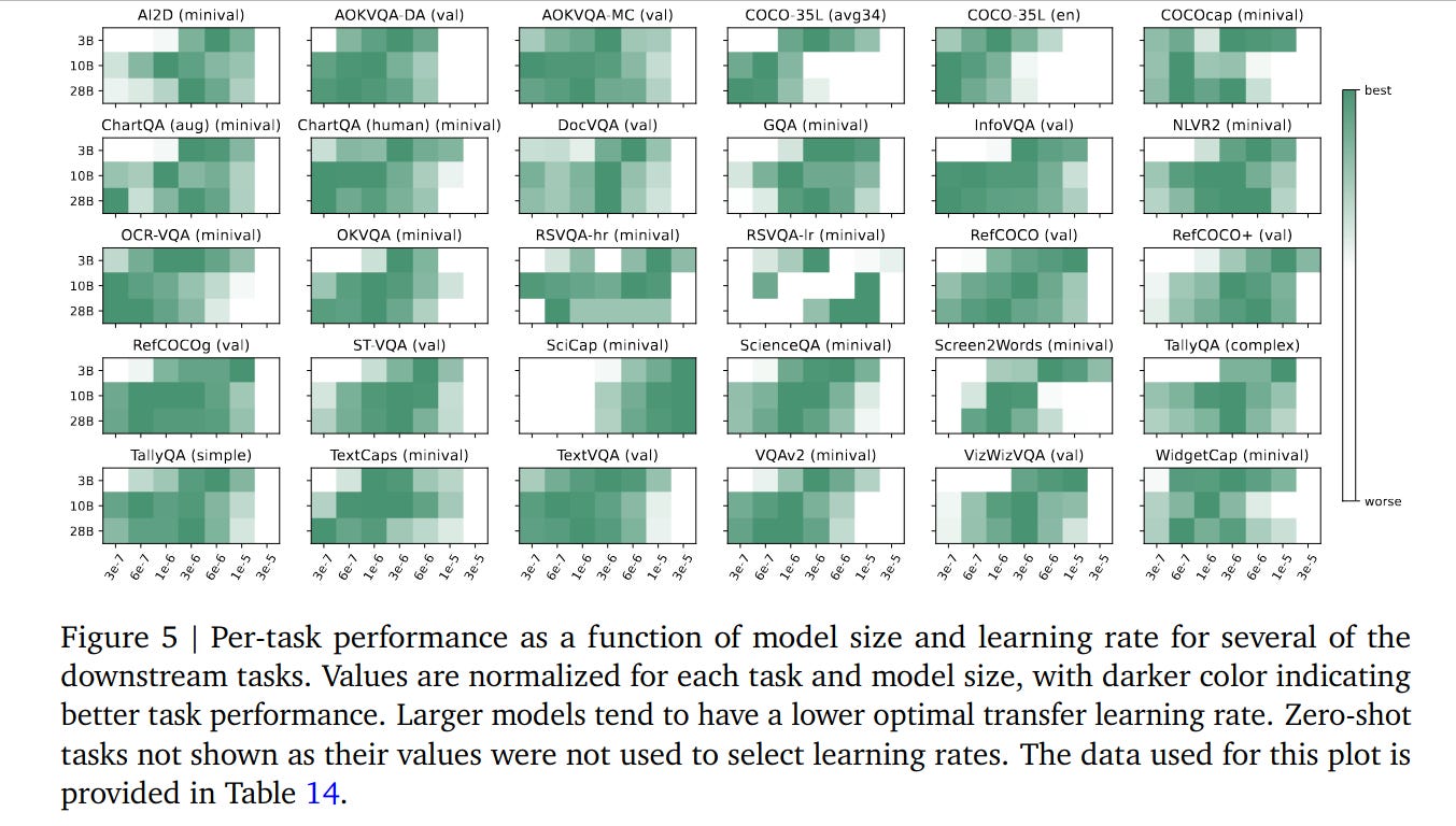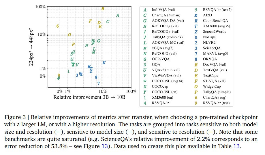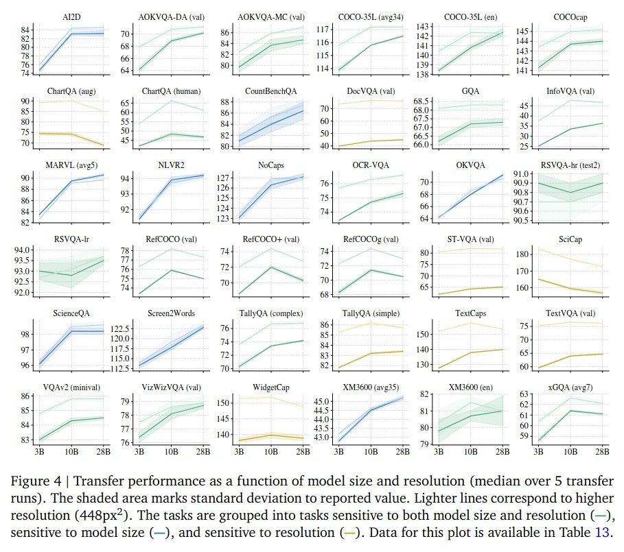 The figures from the Paligemma 2 task transfer and model scaling studies support this narrative up to a point. Most benchmarks show diminishing returns beyond ~10B parameters, and improvements on most tasks tend to be modest (often <10%) when going from 3B to 10B or 28B.